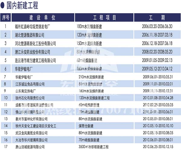 宏順建設工程有限公司是國家批準成立的專業高空作業企業:承攬過(國內.國外)煙囪新建、煙囪防腐、磚煙囪新建、煙囪改造、煙囪維修、煙囪脫硫防腐、煙囪拆除加高、煙囪滑膜等高空作業工程。具有“不搭腳手架 、 不需要停產”施工特點。